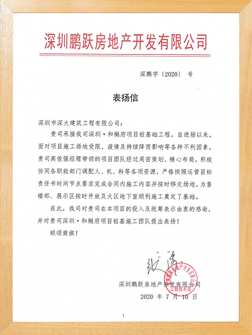 • 越秀·和樾府榮獲深圳鵬躍房地產開發有限公司表揚認可